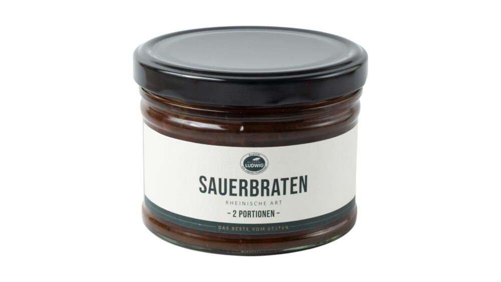 52% Rindfleisch, Trinkwasser, Zwiebeln, 4% Rosinen, Zucker, Branntweinessig, Rotwein, Zuckerrüben, Karotten, SELLERIE, Tomate, modifizierte Stärke, Äpfel, Rapsöl, Speisesalz, Farbstoff: Ammoniak Zuckerkulör; Geliermittel: Pektin; Säuerungsmittel: Milchsäure; Gewürze (mit SENF), Maltodextrin, Kräuter, natürliche Aromen, Stärke, Würze, Aroma.